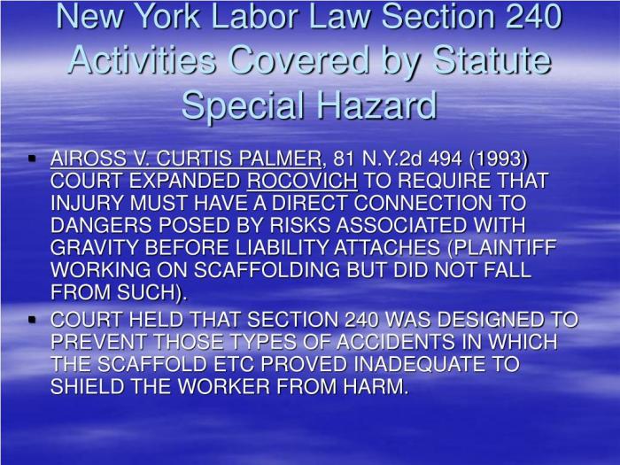 - One notable case is the landmark decision in Haimes v. New York State Electric & Gas Corp., where the court held that the strict liability standard under Section 240 applied even when the worker's own negligence contributed to the accident.